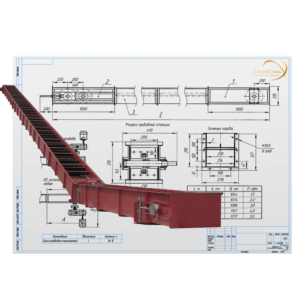 Установки представляют собой закрытые металлические короба прямоугольного сечения, состоящие из типовых узлов. По концам короба установлены приводная и натяжная секции.
